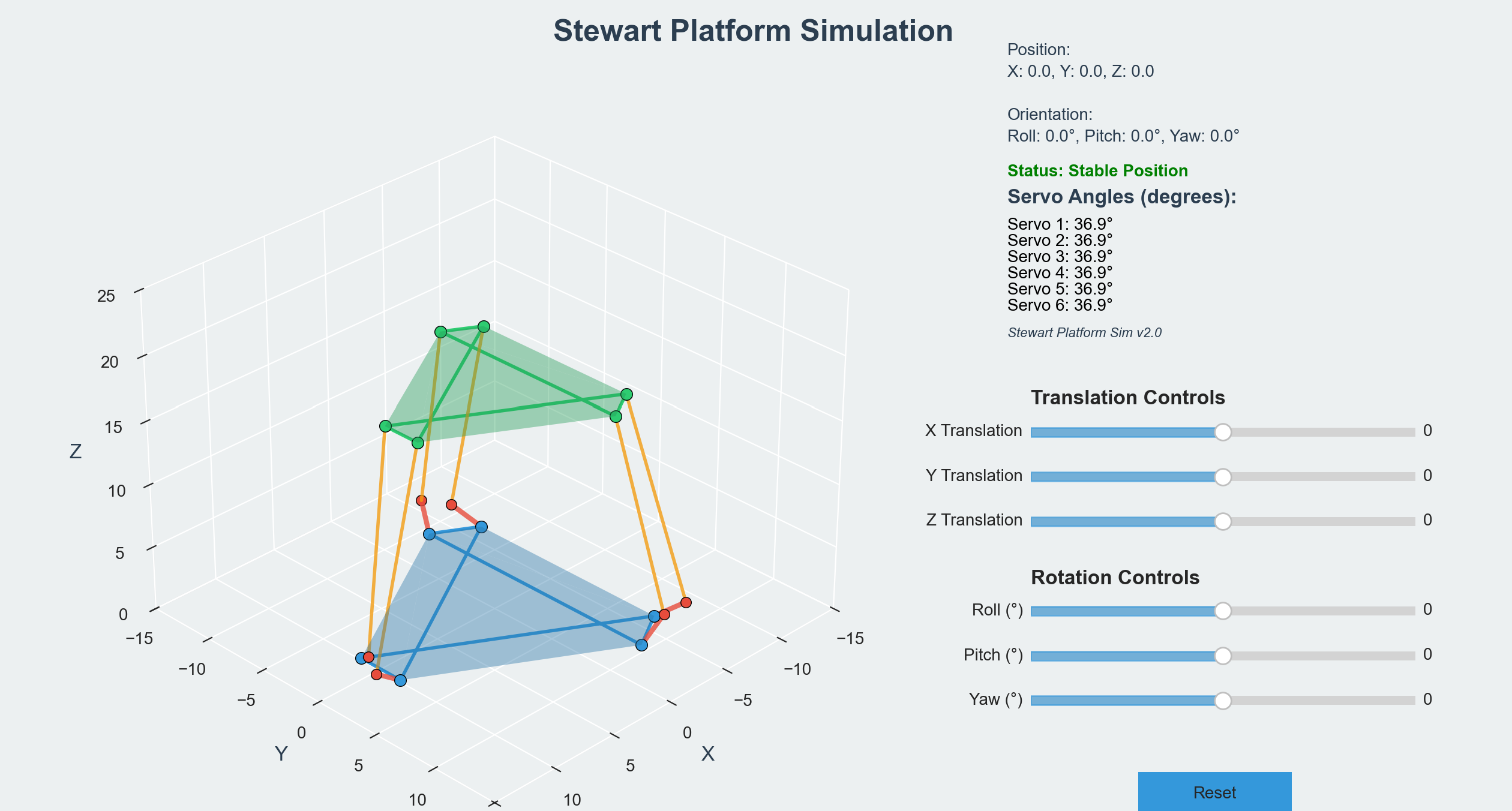 Interactive 3D visualization tool for 6-DOF parallel manipulator with real-time IK solver and stability analysis.